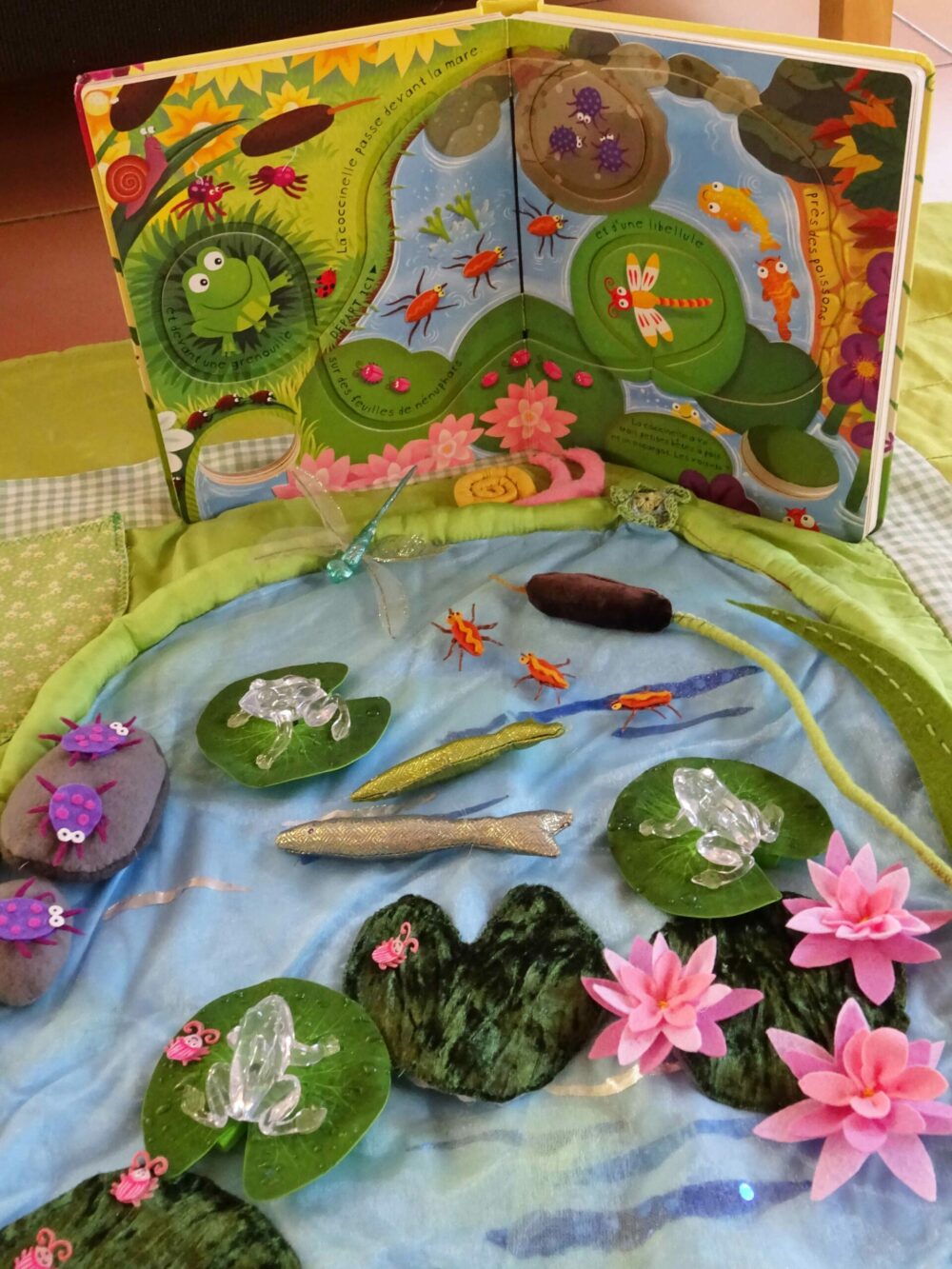 Les personnages du récit, en tissu rembourré, sont à déplacer sur le tapis, qui reprend le décor de l’histoire. La réalisation est très soignée, adaptée à l’usage des tout-petits. Elle respecte l’illustration originale du livre, en accordant une large place aux textures.